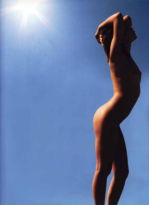 非常にシンプルな構図ですが、女性特有の丸みを持った美しい体のラインがしっかりとらえられています。背中から腰、ヒップにかけてのラインが左からの光を受けてくっきり浮かび上がり、逆にバスト側はシャドウになって、シルエットとしての美しさを持ちました。また、背中の後ろに空間を開けたことで、のびのびした印象も与えています。太陽の入れ方も絶妙ですね。太陽が画面に入っていることで、生き生きとした作品になりました。 |